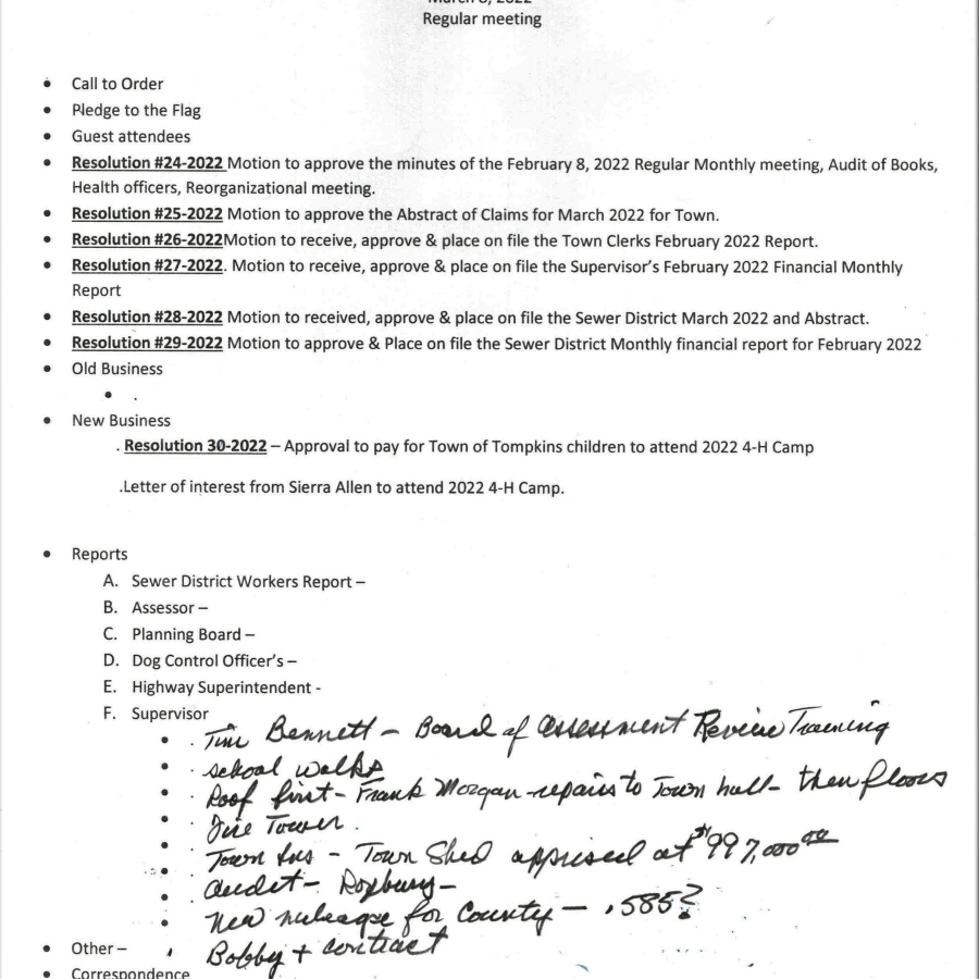 - Ron reported the 2022 Agreement for expenditures of highway monies and the list of roads he would like to repair in 2022. With the sum being $175,000 and to include 78 miles of Town highways, including sluices, culverts and bridges having a span of less than 5 ft and boardwalks or the renewals thereof. RESOLUTION #32 – AGREEMENT FOR EXPENDITURES OF HIGHWAY MONIES FOR 2022 – On motion by LaTourette seconded by Buttel to approve the 2022 Agreement for expenditures of highway monies in the sum of $175,000. All in Favor, Motion Carried.